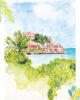 Illustration de l’Eden Rock à Saint-Barthélemy peinte à l’aquarelle avec une technique mixte et reproduite artisanalement.