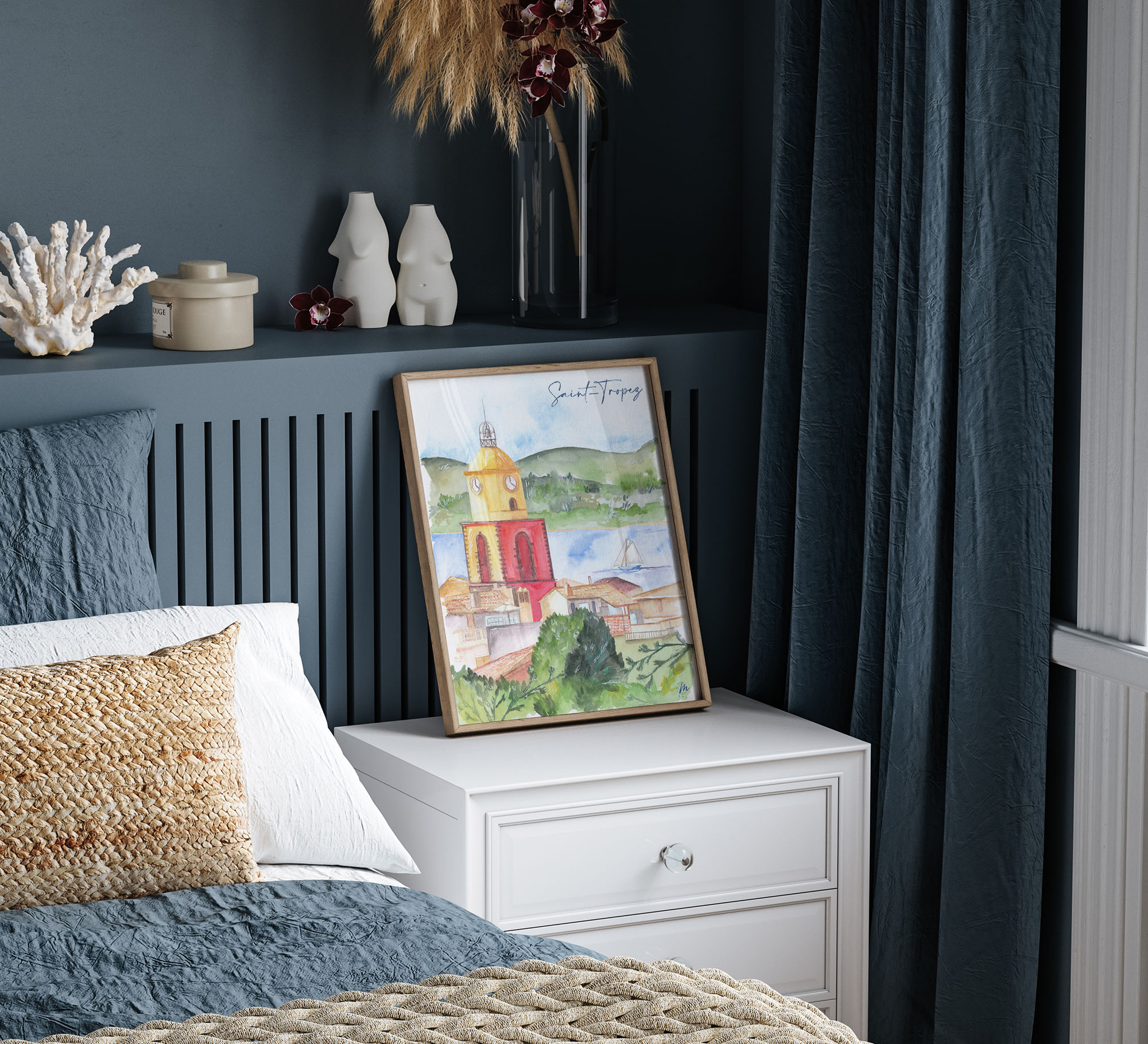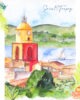 Illustration de Saint-Tropez peinte à l’aquarelle avec une technique mixte et reproduite artisanalement par Moon St Barth.