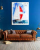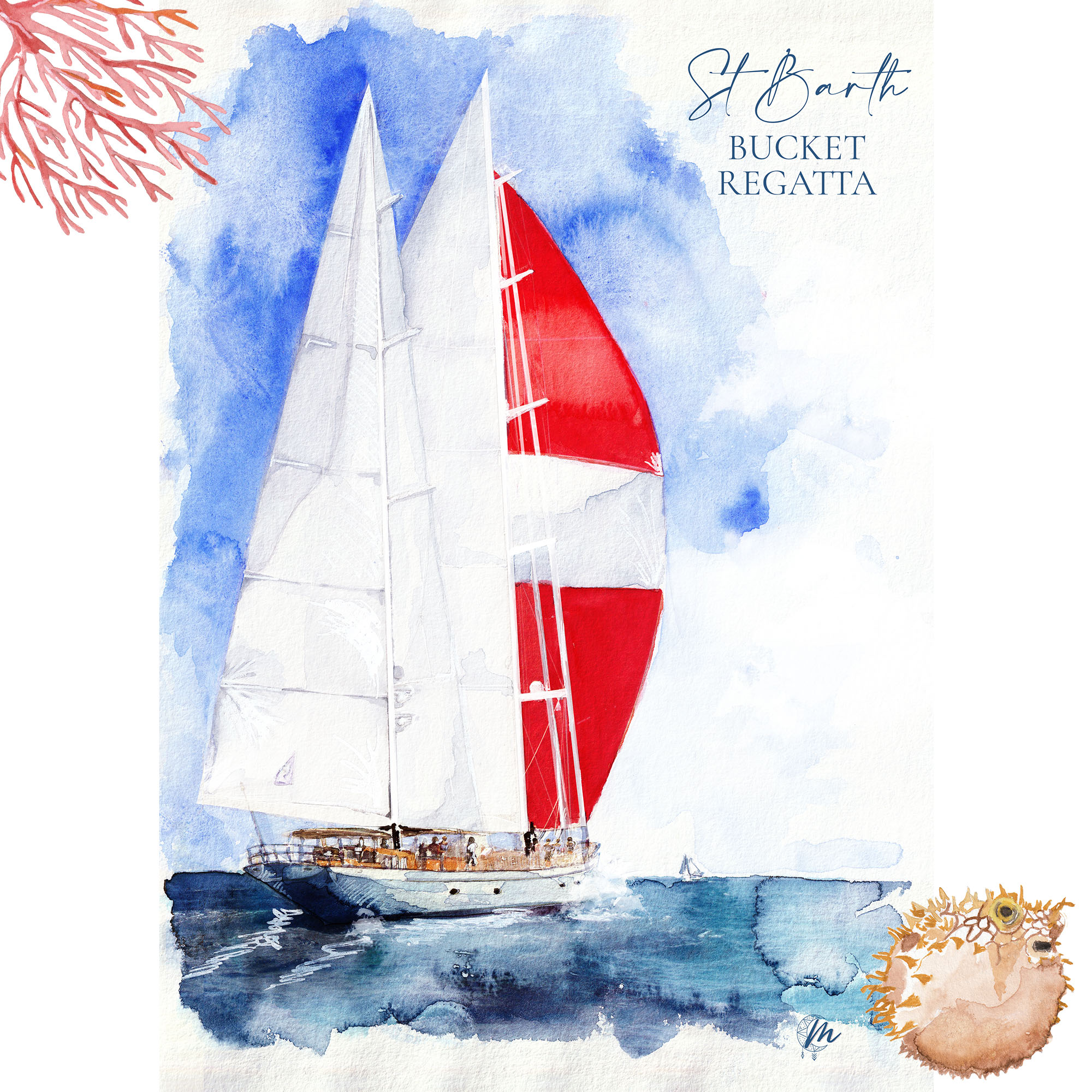 Illustration de la Bucket Regatta à Saint-Barthélemy peinte à l’aquarelle avec une technique mixte et reproduite artisanalement.