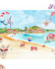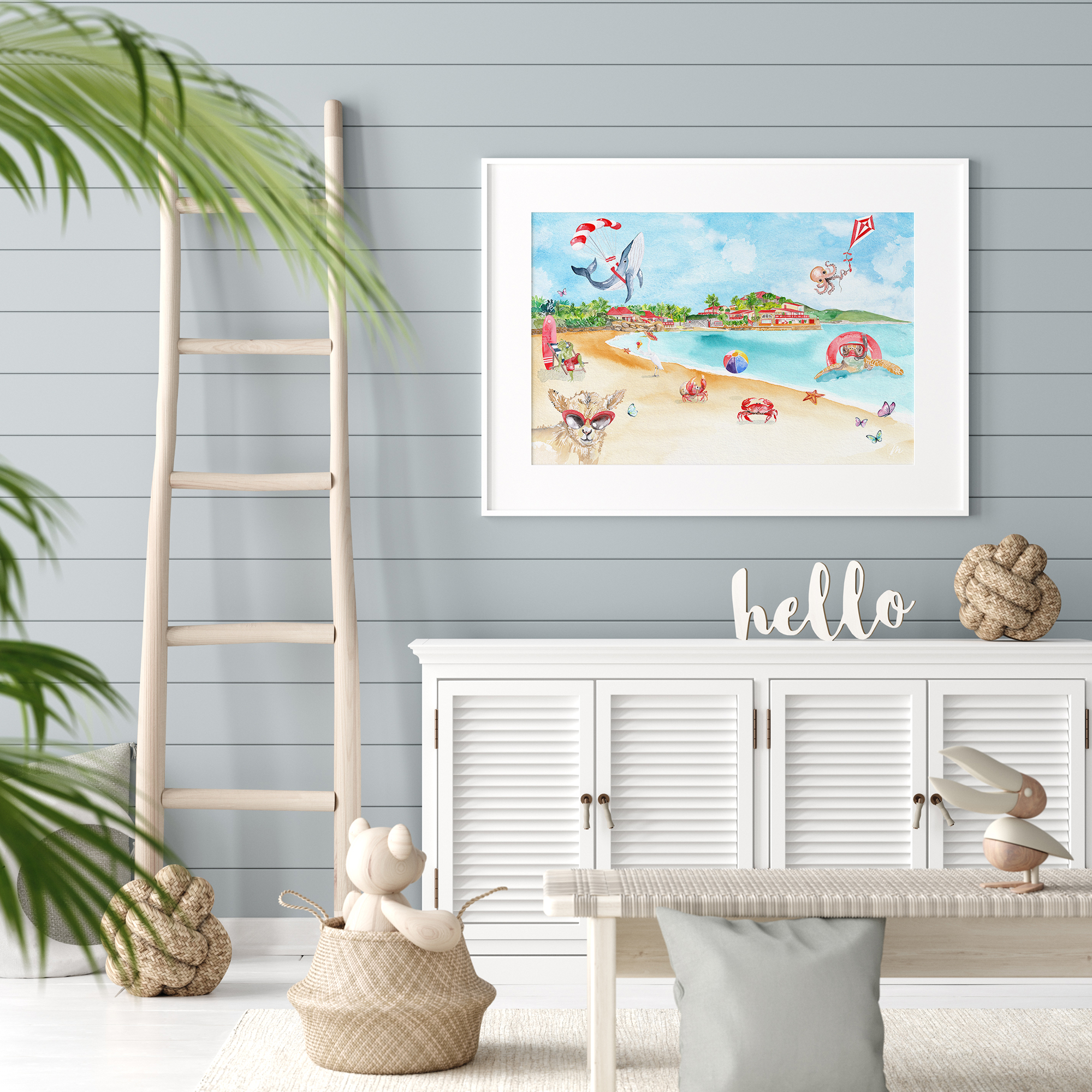 Illustration de l’Eden Rock à Saint-Barthélemy peinte à l’aquarelle avec une technique mixte et reproduite artisanalement mettant à l’honneur le monde des animaux jouant autour du rocher.