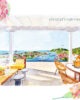 Illustration de l’Hôtel Fouquet’s Saint-Barth à Saint-Barthélemy peinte à l’aquarelle avec une technique mixte et reproduite artisanalement, inspirée d’une photographie de Hugo Allard.