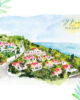 Illustration de l’Hôtel Barrière Fouquet’s Saint-Barth à Saint-Barthélemy peinte à l’aquarelle avec une technique mixte et reproduite artisanalement, inspirée d’une photographie de Hugo Allard.