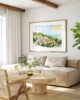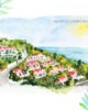 Illustration de l’Hôtel Fouquet’s Saint-Barth à Saint-Barthélemy peinte à l’aquarelle avec une technique mixte et reproduite artisanalement, inspirée d’une photographie de Hugo Allard.
