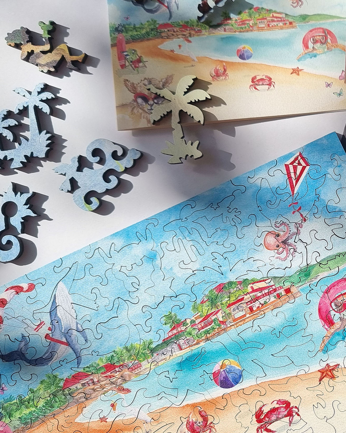 Puzzle pour enfants de 100 pièces représentant une illustration de l’Eden Rock à Saint-Barthélemy peinte à l’aquarelle avec une technique mixte mettant à l’honneur le monde des animaux jouant autour du rocher. Ce puzzle a été créé en collaboration avec Mosaic Puzzles qui propose des puzzles inédits ou chaque pièce est à elle seule une œuvre d’art.